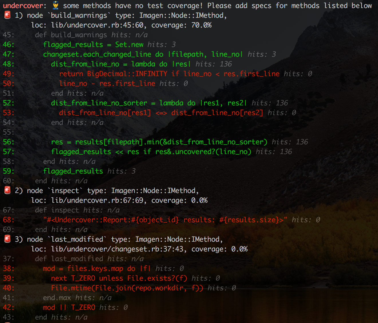Undercover does that and triggers warnings on untested parts of our code based on a changeset from git and a set of rules. Take a look at a sample output below, where undercover checks a recent change in undercover 🙀.