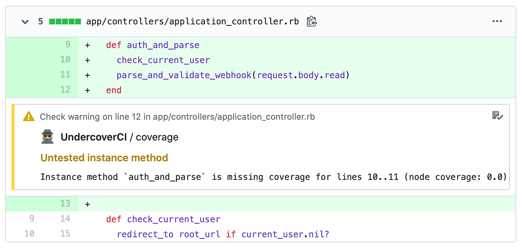 To recap the above points, existing coverage tools for Ruby provide percentage data and diffs, yet they guarantee that all committed lines are covered only if you hit 100% or review the test coverage report manually before each merge. You can automate that effort with UndercoverCI and get PR checks that look like if someone has searched for missing tests in the SimpleCov report. This makes it useful for projects scoring below 100% coverage or ones that won’t give you the confidence of a comprehensive test-suite at all. It’s a focused and local approach, which ensures that you invest in test coverage where it matters most.