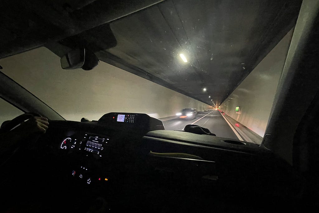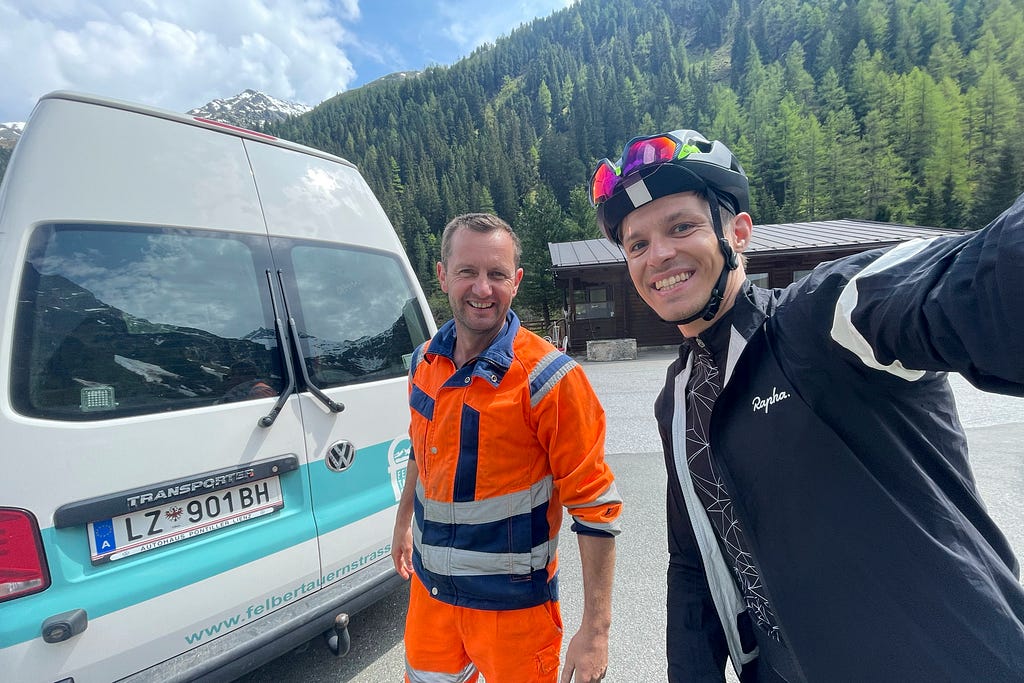 In the town of Matrei close to the tunnel entry, I called the toll booths and organised a minibus transfer. It’s not cheap (€30 per car) and unavoidable, as the 7km tunnel is not open for cyclists. The friendly Austrian tunnel operator who took me & the bike through to the other side provided good company and some laughs.