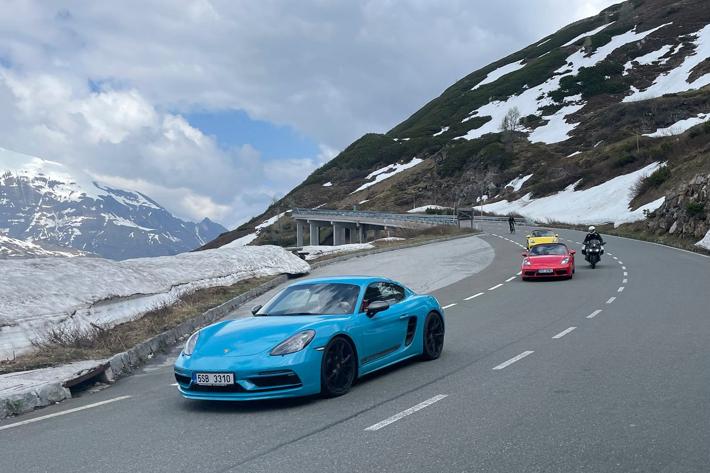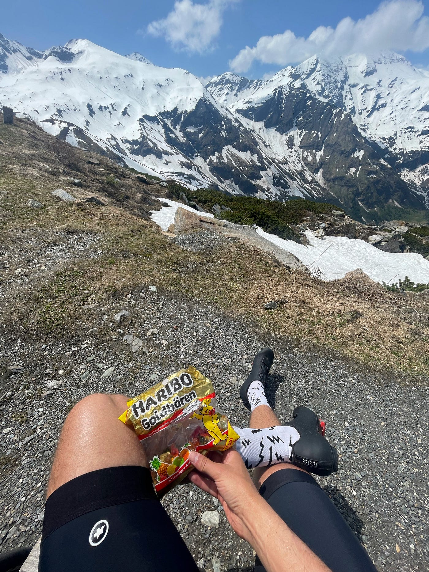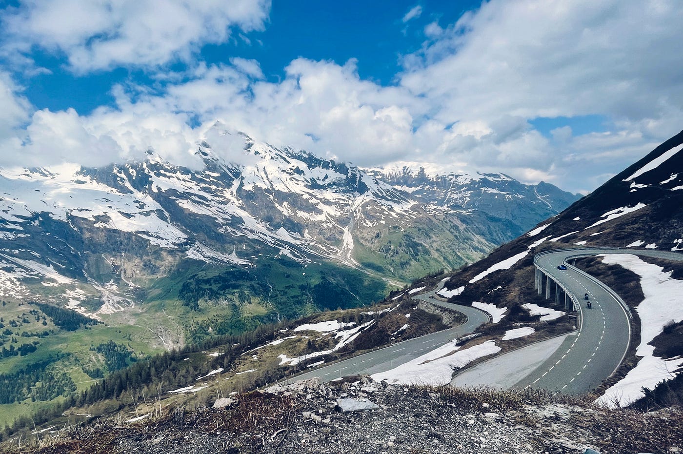 I love cycling up the Hochalpenstraße as an opportunity to observe how the landscape changes with every few hundred vertical meters gained. Few KMs past the toll road booths in Fusch and the forest eventually gives space to mountain pines, barren rocks, and then just snow that kept melting slowly in the sun rays on that day. The air got chilly. The breathtaking views really opened up. There was a moment where I could see far ahead into the valley, where the climb begun. I have no idea how far it was, but the distance was spectacular. Finally, a dozen or so switchbacks until the end I could see Fuscher Törl with the iconic 180-degree final turn and viewpoint, marking the end of a 2h+ climbing effort.